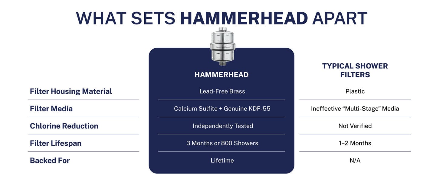 HammerHead Showers filters have been 3rd party tested to effectively reduce chlorine and heavy metals so you get cleaner water in your shower, making your skin, hair and nails smoother than ever before!