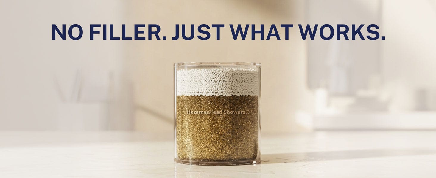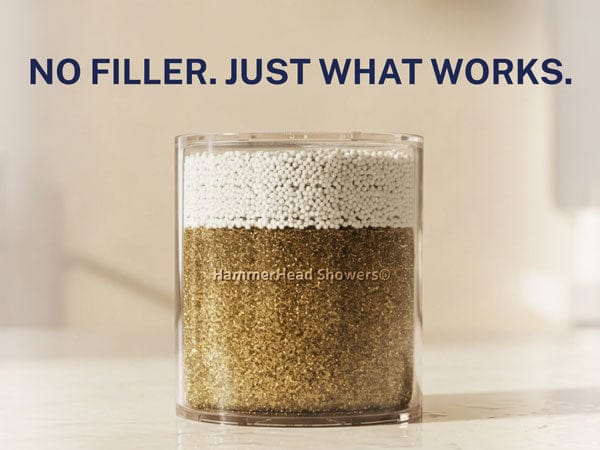 The HammerHead Showers Shower Head Filter is packed with the highest quality filtration media, including a proprietary blend of KDF 55 and Calcium Sulfite, the two most effective types of filtration media for shower head filters.